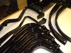 The parts are back from stove enamelling. They look nice & shiny & black. Safely stored on the shelf for the time being, they will be refitted later.