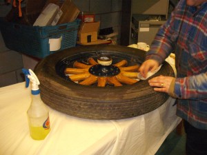 We left the rear wheels in place. They are stuck fast on the tapered axle, and we need a wheel puller to get them off. I was going to use a method I read on the AACA forum http://forums.aaca.org/f165/how-do-wheels-come-off-320943.html that involves use of a big hammer, but Magic Brian has offered to make a puller, so we will wait and do it the correct way.