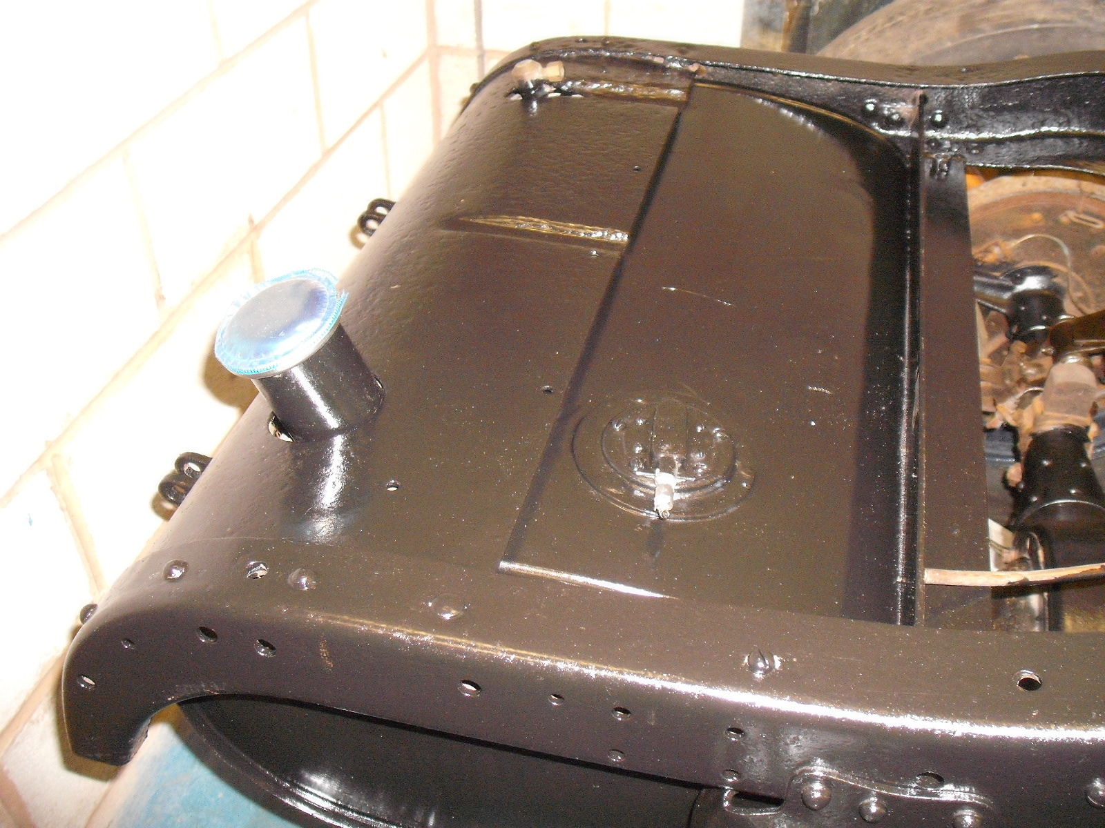 We got the front wheels off easy and Little Phil made a good job of cleaning them up. The front right is fine, but the left wheel has suffered more from the damp storage conditions, and some of the blue paint needs touching up.